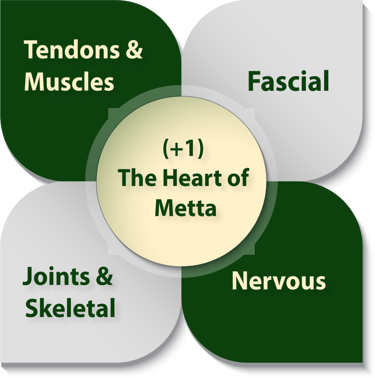 The 4+1 System connects the body’s four core structures — tendons & muscles, fascia, nerves, and joints — with the +1, representing mindful awareness and compassion, the invisible energy that flows through every session.